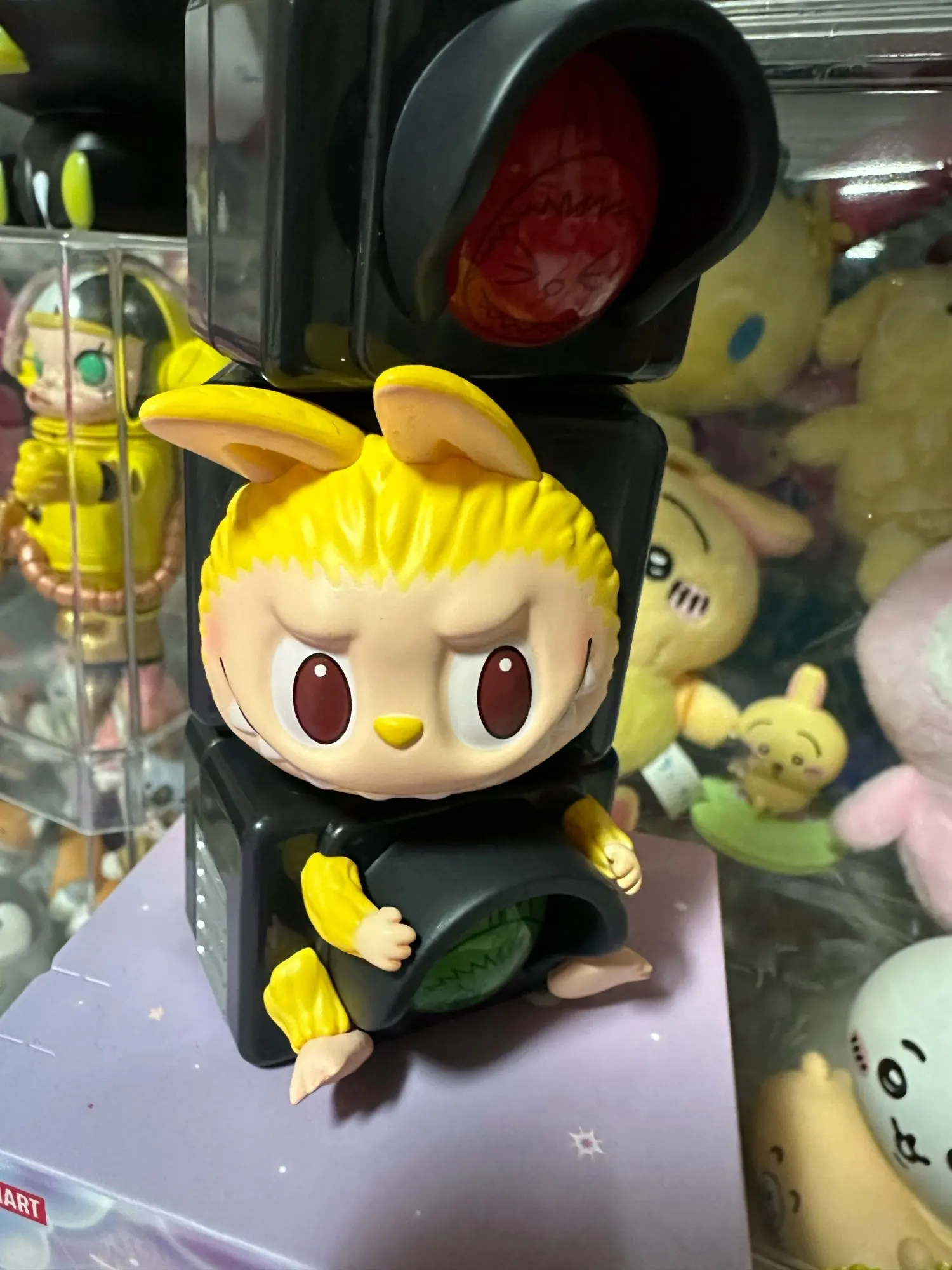 - Labubu partiellement caché derrière différents éléments.